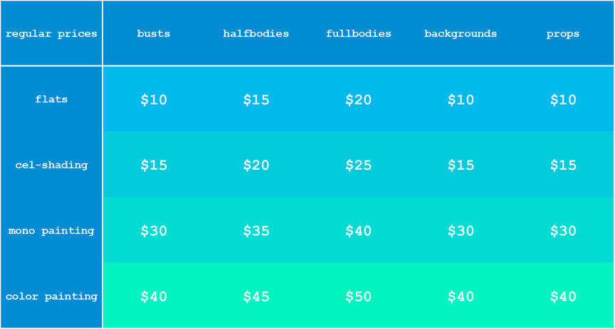 - discounts: [ study | returning commissioner | multiple characters ]feel free to contact me if you’re confused, and remember that all of these are starting prices and can change due to complexity.finish levels (examples here)